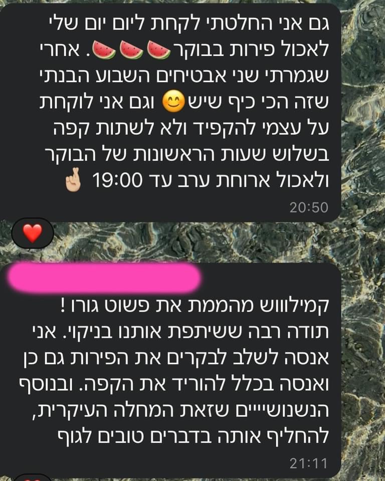 אם אתם רואים את עצמכם במסע שלי, הזדהתם ואתם רוצים שינוי, תפנו אליי להתאמת האורח חיים שלכם באופן שיטיב עם הבריאות שלכם.